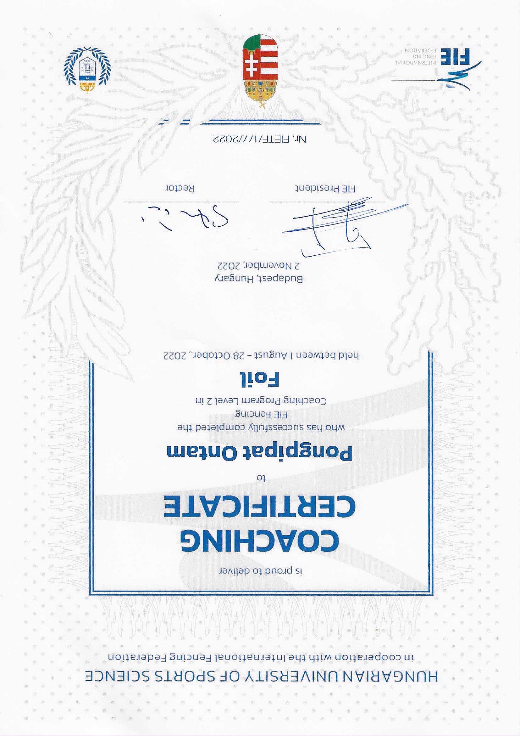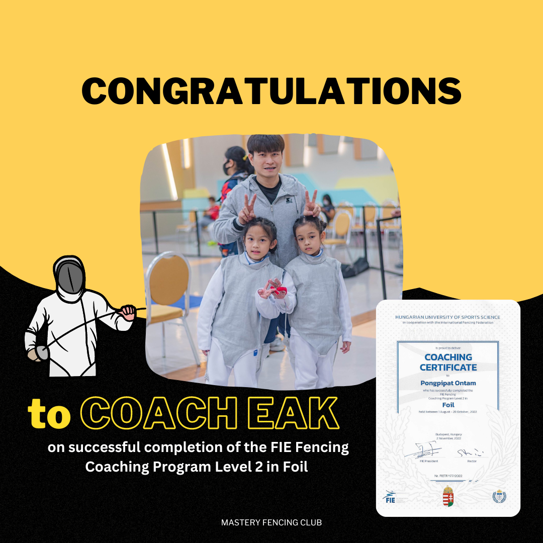 ขอแสดงความยินดีกับ "โค้ชเอก" ที่ผ่านการอบรมหลักสูตร the FIE Fencing Coaching Program Level 2 in Foil จากประเทศฮังการี