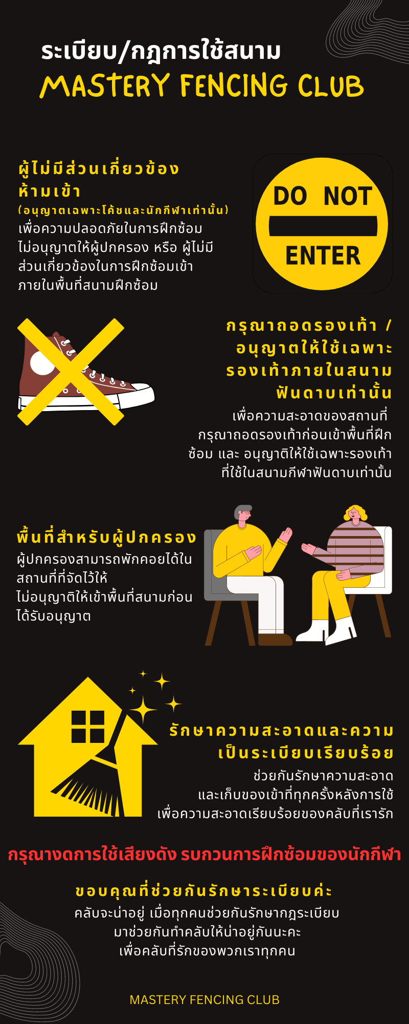 1.กรุณาถอดรองเท้าก่อนเข้าพื้นที่สนาม และอนุญาติให้ใช้รองเท้าที่ใช้เฉพาะภายในสนามกีฬาฟันดาบเท่านั้น เพื่อสุขอนามัยที่ดี